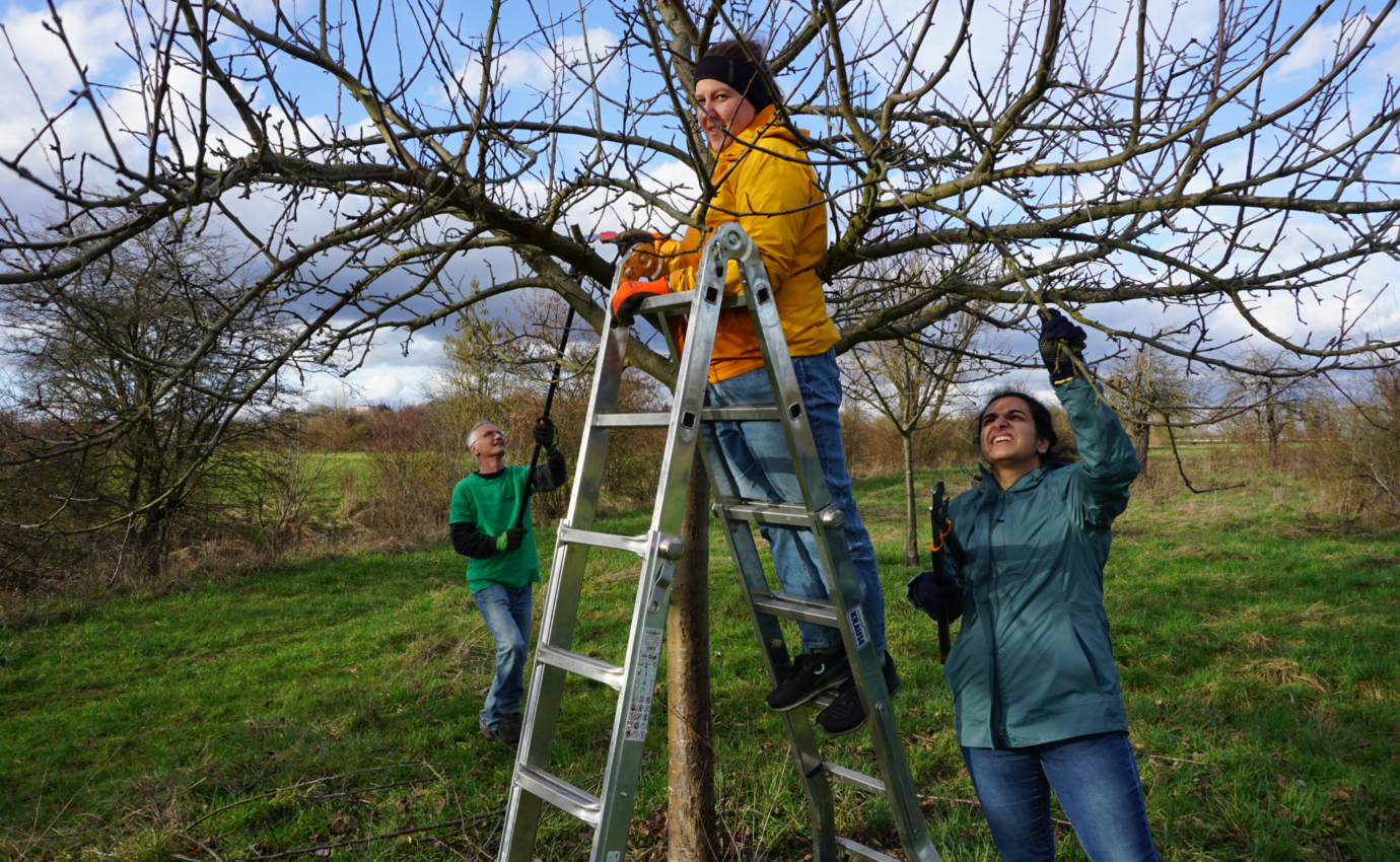 Nach anfänglicher Zurückhaltung haben wir uns dann nach und nach doch alle getraut, den Bäumen mit Gartenschere oder Säge an die Krone zu gehen. Hochmotiviert und unter Anleitung der BUND-Aktiven konnten wir so erste Erfahrungen mit dem Schnitt von Apfelbäumen sammeln und hatten dabei jede Menge Spaß. Die Ergebnisse konnten sich sehen lassen!